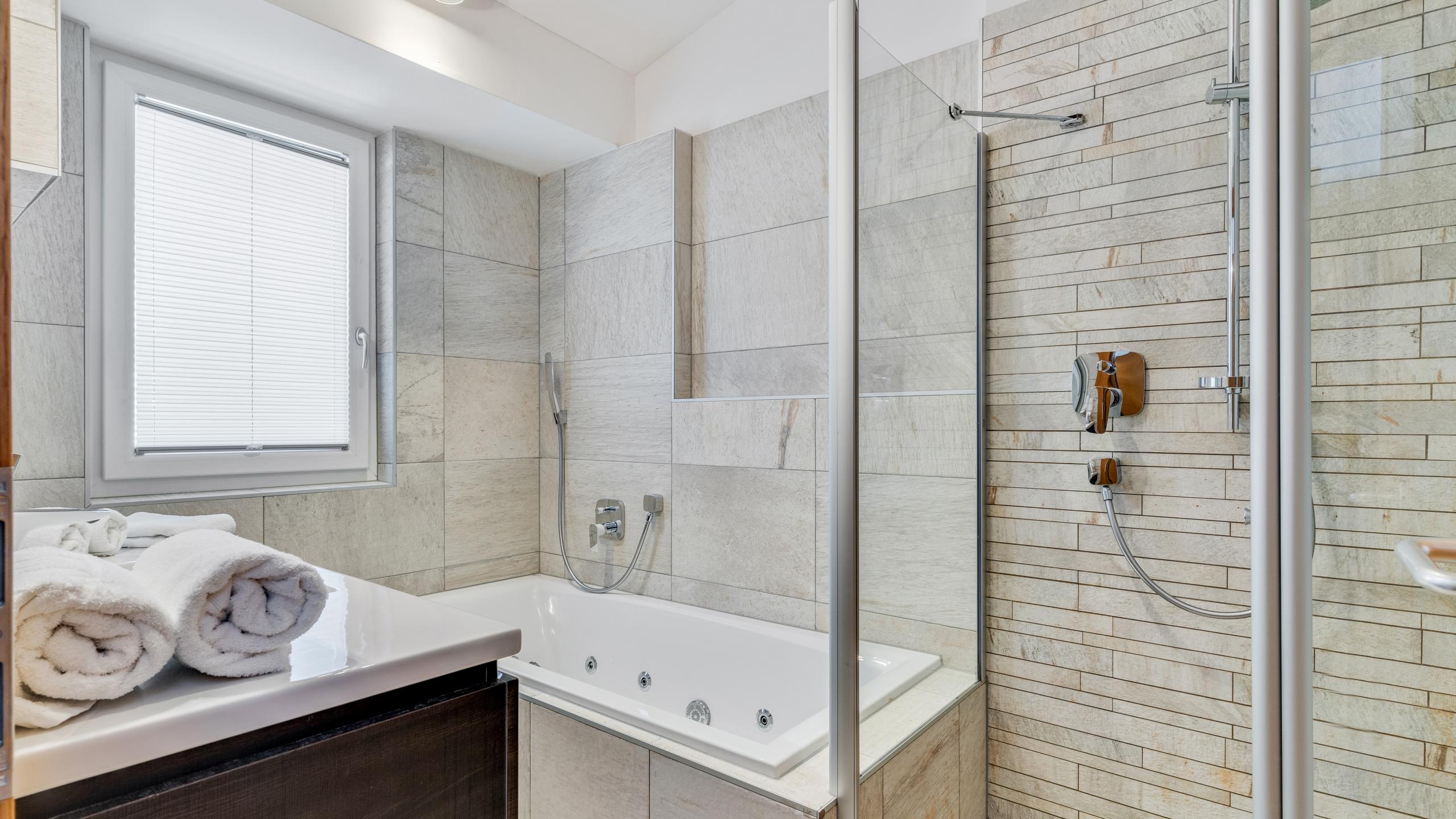 Fully equipped kitchen with Nespresso machine| Open fireplace | Large sun terrace | Two double bedrooms with twin beds | Two bathrooms: one with a walk-in shower and whirlpool tub, the other with a walk-in shower and WC | Separate WC | Safe | Ground floor location